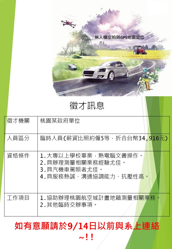 徵才訊息》 各位同學呀,這個職缺機會難得,有意願快快於9/14日前與系上連繫呦~~~~