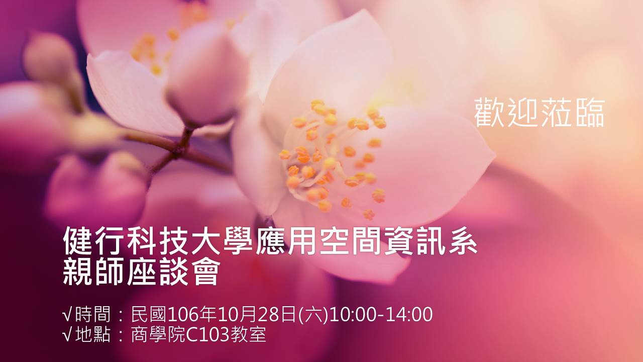106年度親師懇談會,將在106.10.28舉行 2017-10-04 親愛的家長您好 「大學生活」是人生學習過程中非常重要且精彩的一個階段,為增進您對應用空間資訊系學習資源的掌握以及貴子女在本系修讀情況的了解,特別舉辦「健行科技大學應用空間資訊系親師座談會」,誠摯要求您的參與。 本次活動資訊 時間:民國106年10月28日(六) 10:00-14:00 地點:商學院C103教室 期待您們的到來 親師座談會邀請函.pdf 活動報名 Tweet 列印本頁