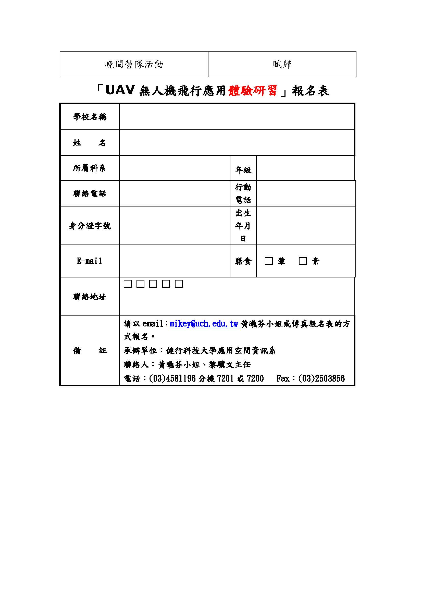 報名方式:請填妥2017【UAV無人機飛行應用體驗研習】(寒假)報名表後,請寄至mikey@uch.edu.tw信箱收,並請於寄信後電知主辦單位,確認是否收到活動報名表。