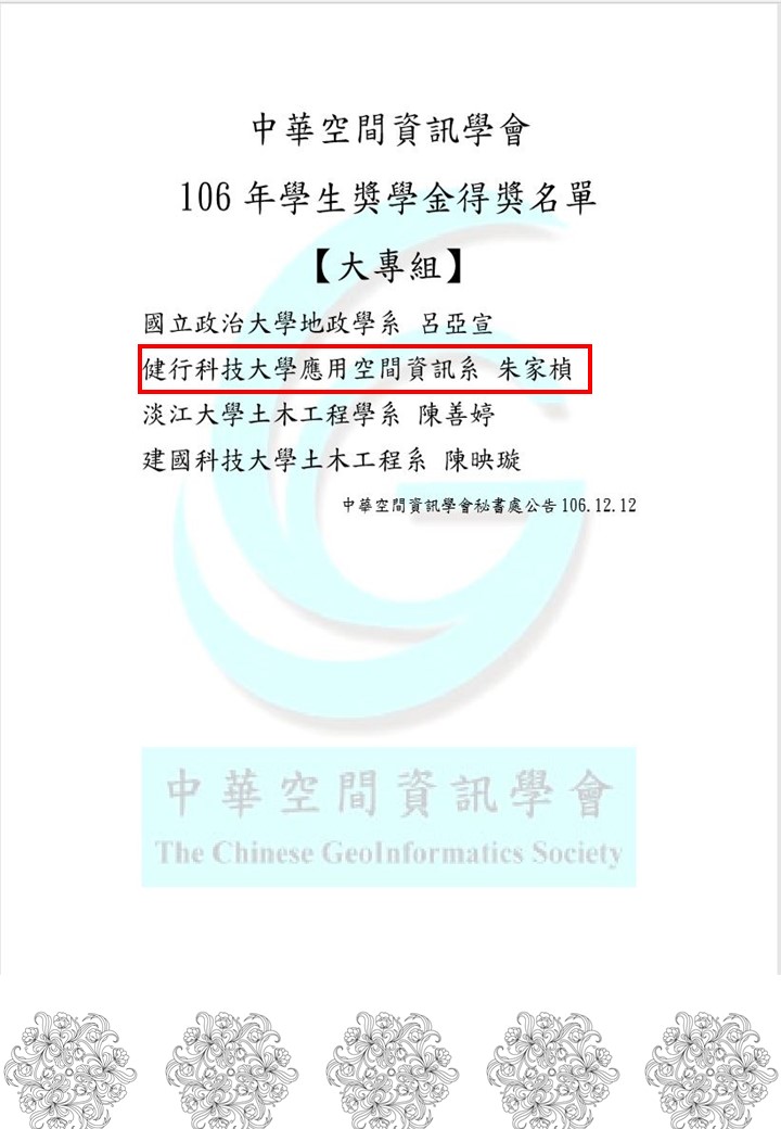 恭賀本系大學部三年級朱家楨同學榮獲106年度中華空間資訊學會大專組學生獎學金